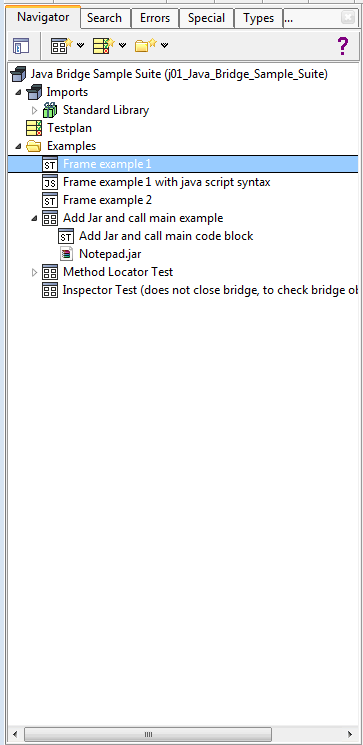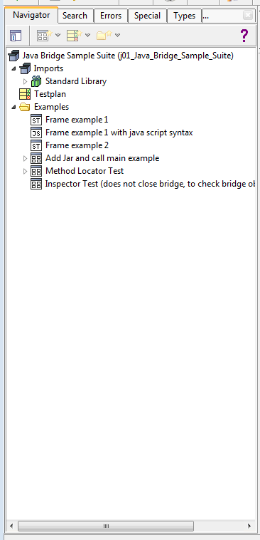 The navigation tree component of the expecco browser application shows the hierarchy of [[Tree Elements/en|tree elements]] inside a test suite. The UI component actually consists of various subcomponents, which are selected via a tab-bar at the top: