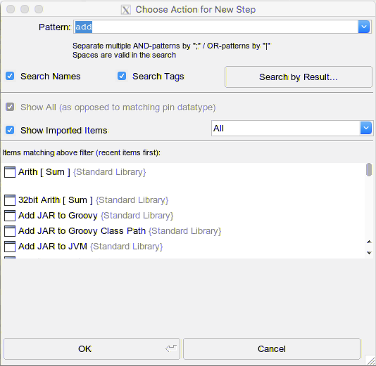 You can search for the action to be placed either by name, tag or by the desired operation result.