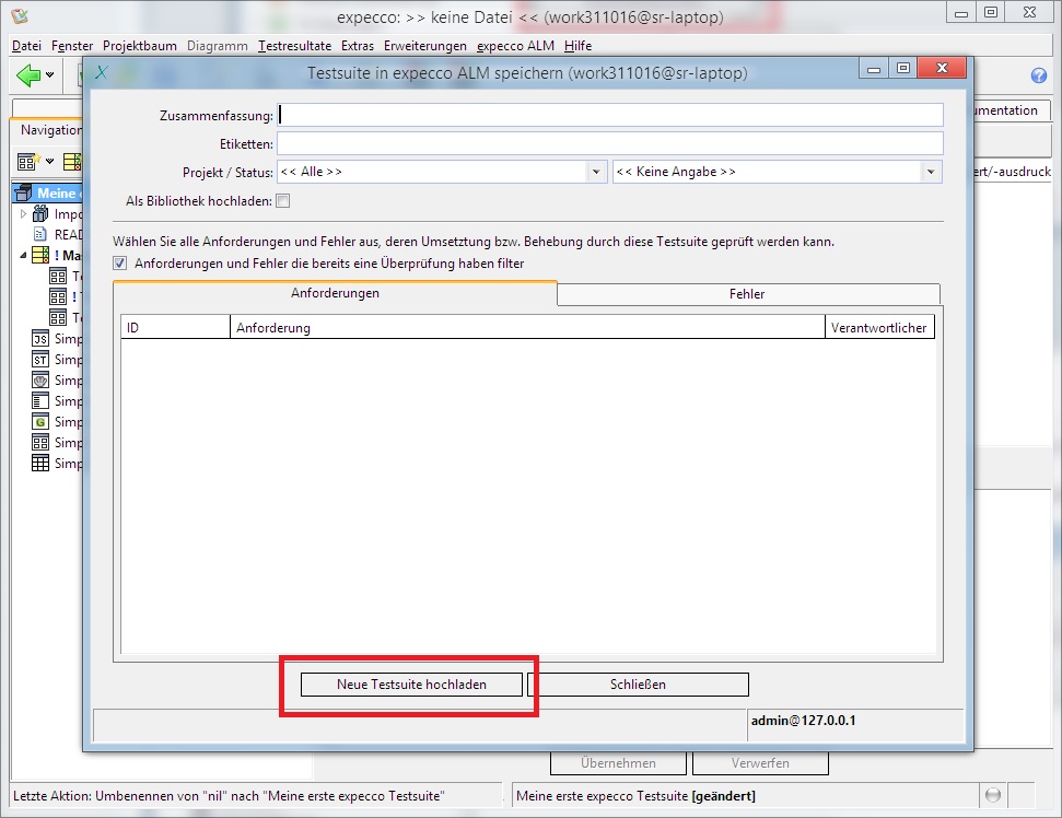 Nachdem Sie Ihre Testsuite erweitert oder verändert haben, rufen Sie erneut den "Sichern in expecco ALM" Dialog auf: