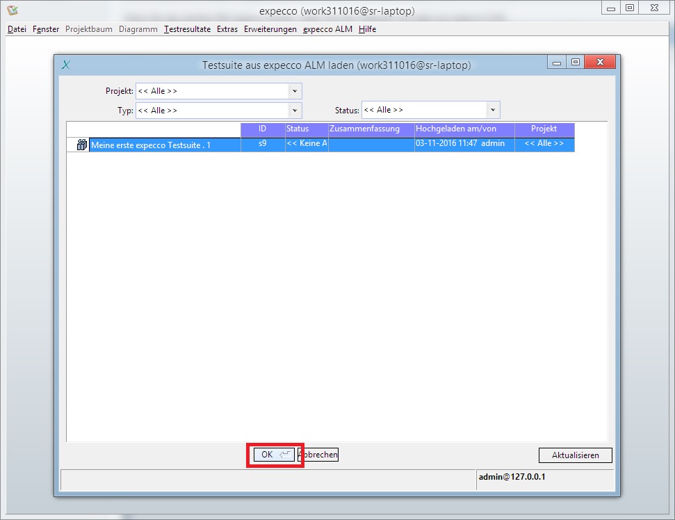 Wenn Sie das nächste Mal expecco starten, laden Sie Ihre Testsuite wie folgt aus expecco ALM: