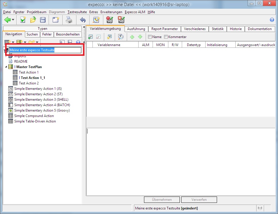 Geben Sie Ihrer Testsuite vor dem Speichern in expecco ALM einen aussagekräftigen Namen. expecco ALM verwendet das Label des Root-Elements des Navigationsbaums als Namensvorlage für die Testsuite.