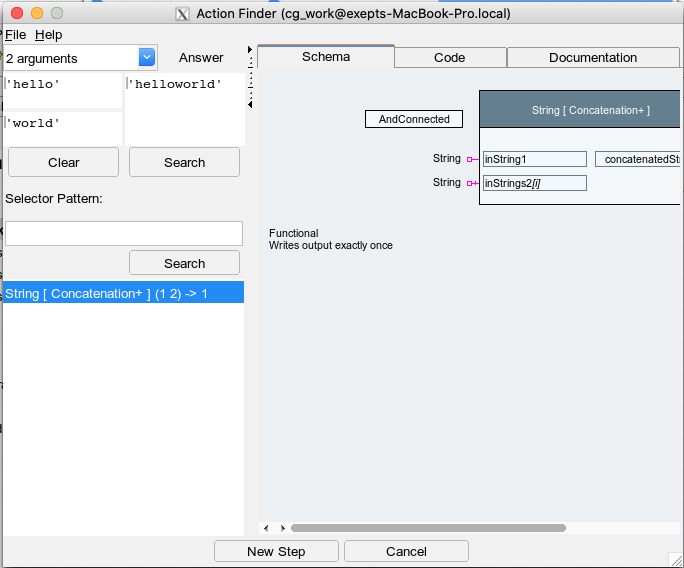 Assume that you need to find an action block to concatenate two strings. I.e. you need an action with 2 input pins where we want to provide the values "hello" and "world", and which should generate "helloworld" at its output pin: