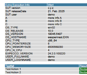 Expecco can generate reports in a number of formats: as human readable PDF or HTML documents, or as machine readable XML-, CSV- or plain text containing all relevant information on the test execution. XML reports are further provided in 3 different formats: Junit compatible, Nunit compatible and the full detail XML.
