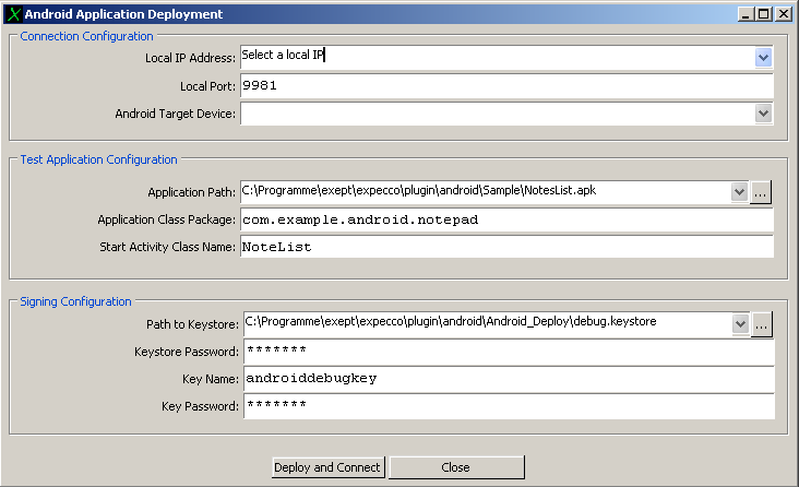 In expecco, open the "Android Deployment Tool" found in the "Plugin"->"Android" menu. The following dialog has to be filled: