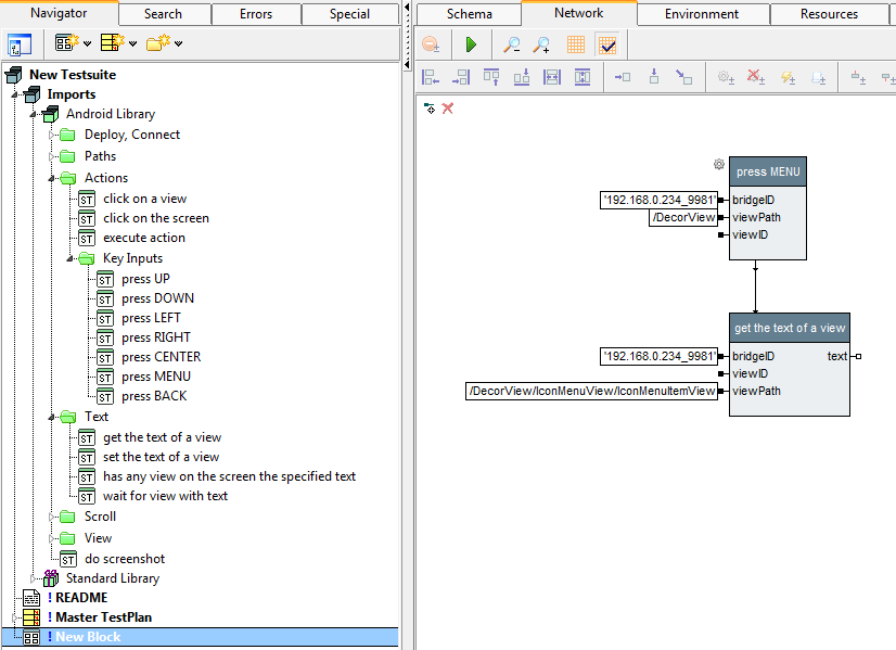 - Now connect the input-pins of the "get the text of a view": copy the input of the "bridgeID" from the "press MENU" block and paste it to the "bridgeID" input-pin of the "get the text of a view"