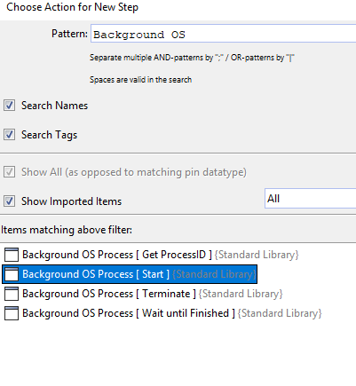Es öffnet sich ein Dialog mit einer Liste von verfügbaren Bausteinen, die Sie Ihrem aktuellen Baustein hinzufügen können. Dort geben Sie als Pattern "Background OS" ein und sehen nun die gefilterte Liste. Wählen Sie bitte den Baustein "Background OS Process [ Start ]" aus und drücken OK.