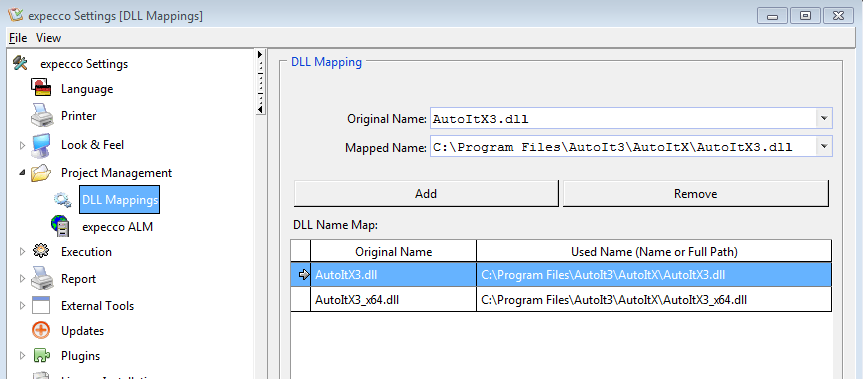 Notice that the low-level interface to the autoIt library is implemented in the expecco action block library by DLL-calling action blocks. There, only the name of the library (not its absolute path) is defined. This avoids the need to change the library when the dll is located at a different location. Also notice, that the DLL-mapping is stored in the user settings, not in the project itself.