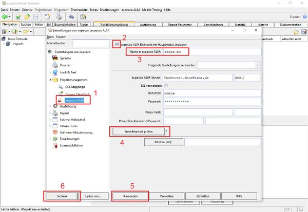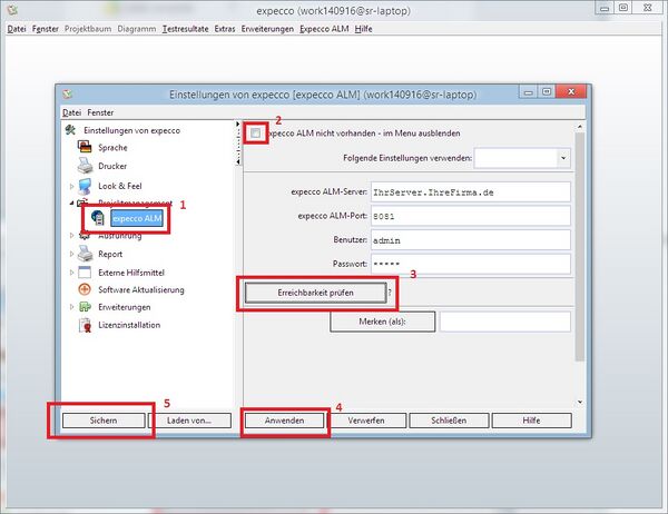 Das zusätzliche Feld "Name in expecco-ALM" definiert den Rechnernamen, wie er in ALM erscheinen wird (vormals erschien dort nur der Hostname). - Durch "Anwenden" werden die Einstellungen für die aktuelle Sitzung übernommen (5);