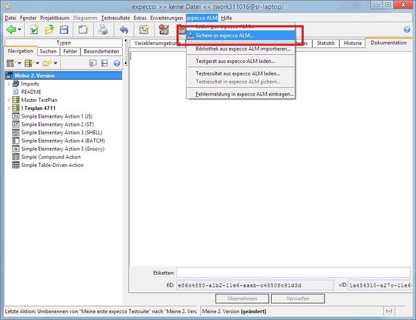 Zum Speichern nach expeccoALM öffnen Sie den dazugehörigen Dialog wie folgt: