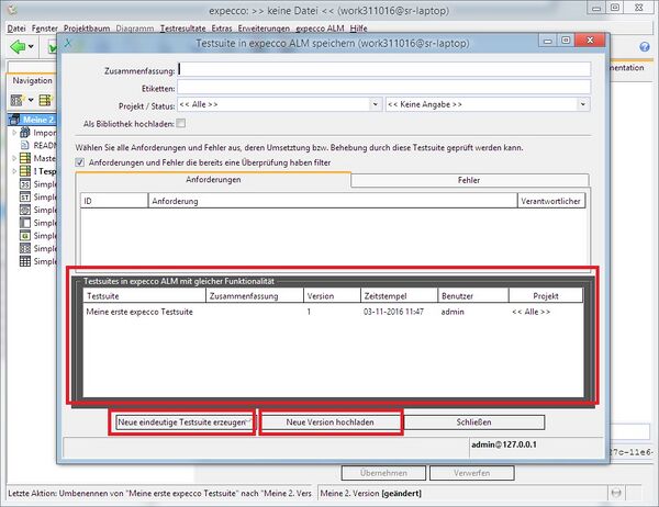Nachdem Sie Ihre Testsuite erweitert oder verändert haben, rufen Sie erneut den "Sichern in expeccoALM" Dialog auf: