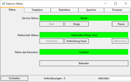In beiden Startvarianten (bei laufendem expecco, sowie bei "alleinstehend" gestartetem expecco) erscheint ein neues kleines Fenster (sog. "Trayfenster") unten in der Windows bzw. Linux Toolbarleiste, in dem der aktuelle Status angezeigt wird: