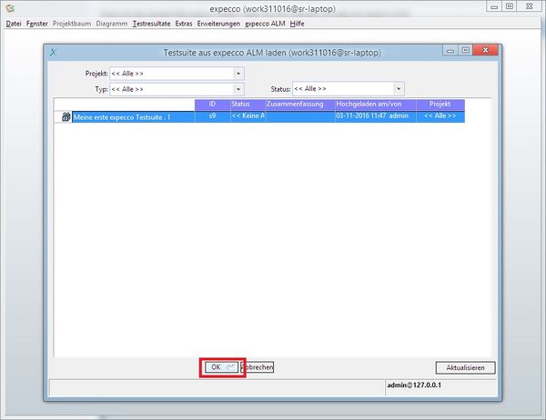 Der Dialog "Testsuite aus AIDYMO Laden" zeigt Ihnen alle verfügbaren Testsuiten an. Es gibt Projekt-, Status- und Typ-Filter um die gewünschte Testsuite schnell zu finden.