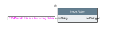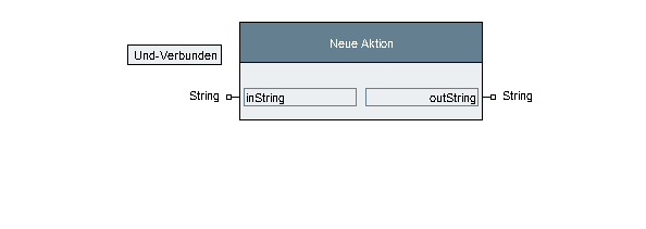We first define the external interface of that action block to consist of an input-pin named "inString" and an output-pin named "outString". Both pins are declared as being of "String"-datatype, this ensures, that when placed into a diagram, only other String-typed pins can be connected to it. The so called "schema" definition of the action block is therefore: