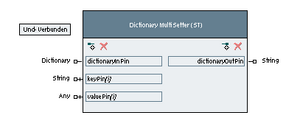 The source code is usually edited in the code editor. It is interpreted according to the used language’s syntax at runtime. For the builtin languages Smalltalk and JavaScript, it is possible to switch the syntax pattern for already implemented blocks, causing the code to be automatically converted to that particular syntax style. The values of data pins can be directly accessed (read and write) in the code using getters/setters on the pin's name. The external interface of an elementary block (e.g. number of pins) is defined in the schema editor.