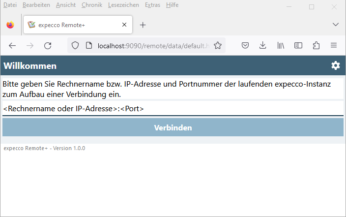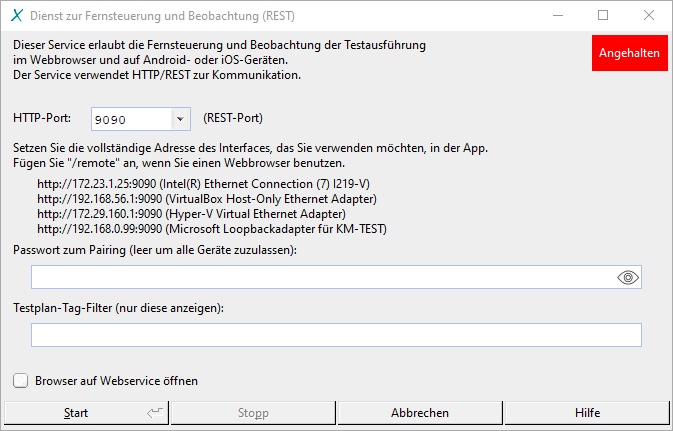 - Anhaken von "Browser auf Webservice öffnen" öffnet mit Starten des Services den lokalen Browser mit der Webanwendung von expecco Remote.