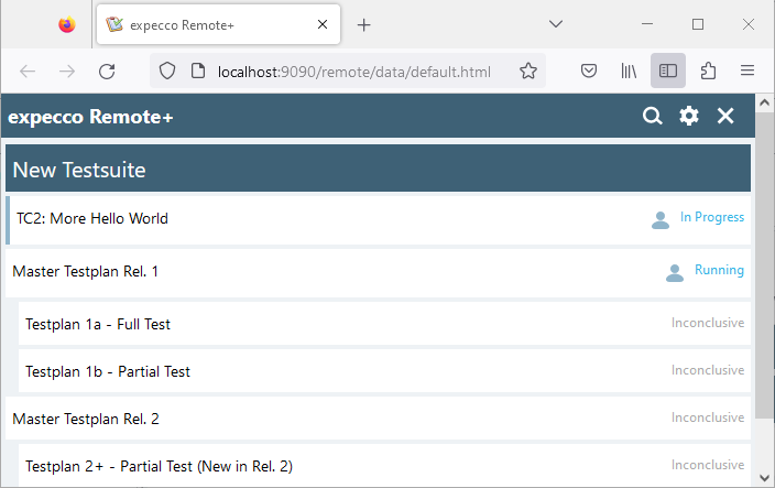 Nach dem Verbinden sehen Sie eine Übersicht aller Testsuiten, die in expecco geladen sind. Zu jeder Testsuiten wird der aktuelle Status angezeigt. Falls ein Test auf eine Benutzereingabe wartet, erkennen Sie das an einem entsprechenden Icon.