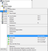 Um die Hierarchieebene der Aktionsbausteine im Ordner oder deren Anordnung zu verändern, verschieben Sie diese mittels Drag&Drop oder klicken Sie mit der rechten Maustaste auf den jeweiligen Baustein um ein Kontextmenu zu erhalten.