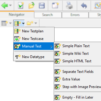You will find action blocks for manual test steps in the toolbar menu for new actions (). When executed, these actions will open a dialog which guides the user through the manual test. The dialog presents an informative text and awaits a confirmation of the user.