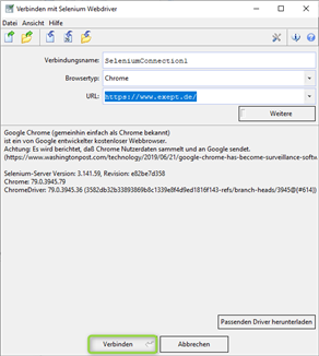 Nach Klick auf "Verbinden" wird der Browser geöffnet, und die Seite angezeigt.