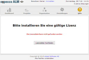 Falls Sie eine aktuelle expecco ALM Version haben, können Sie eine neue Lizenzdatei "expecco ALM Lizenz *.lic" über das Webinterface von expecco ALM einspielen. Betrachten Sie dazu den angehängten Screenshot (Anhang 2).