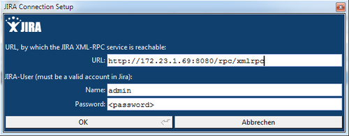 Opening "Extras" → "Settings" → "Plugins" → "JIRA Interface" you can enter the JIRA connection details. If you enter them using the settings instead of the connection dialog itself you don't have to reenter them if you need to reconnect.