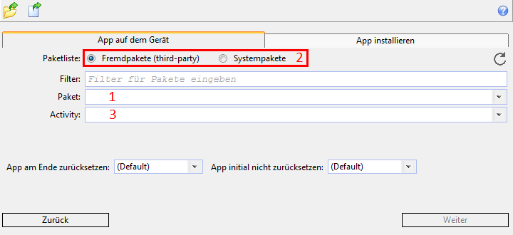 Als nächstes geben Sie an, welche App Sie verwenden wollen (Abb. 5). Dabei können Sie wählen, ob Sie eine App starten möchten, die bereits auf dem Gerät installiert ist ("App auf dem Gerät") oder ob eine App installiert und gestartet werden soll ("App installieren"). Für den Fall, dass Sie eine bereits installierte App benutzen wollen, erhalten Sie eine Liste aller auf dem Gerät installierten Pakete (1), die in Systempakete und Fremdpakete (2) unterteilt sind, sowie deren Activities (3). Diese können Sie dann einfach in den jeweiligen Feldern auswählen.