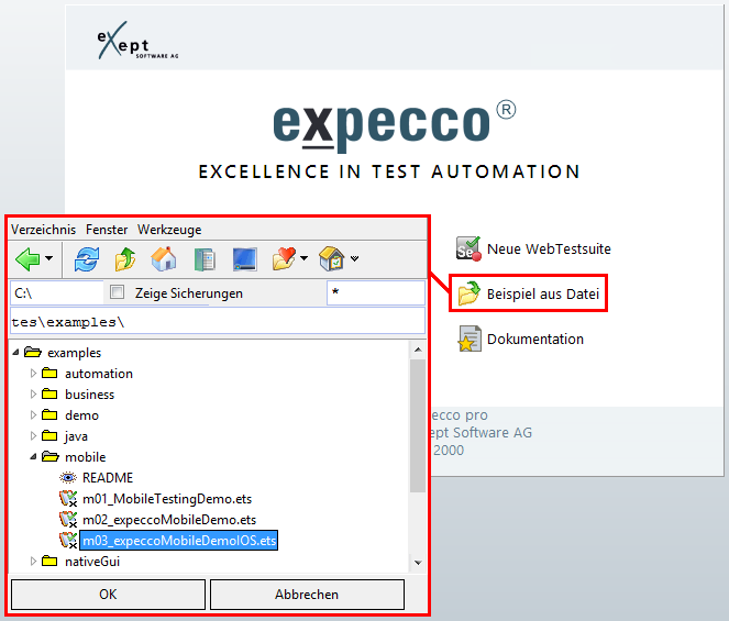 Starten Sie expecco und öffnen Sie die Testsuite "m02_expeccoMobileDemo.ets" über die Schaltfläche "Beispiel aus Datei" (Abb. 1). Ab expecco 2.11 befindet sich diese im Unterordner "mobile". In dieser Testsuite befindet sich bereits ein vorgefertigter Testplan mit einigen Testfällen für diese App.