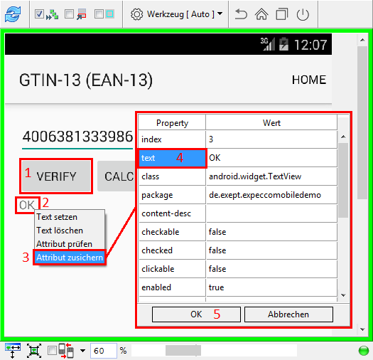 Klicken Sie nun auf "Verify" (1) (Abb. 14). In der App erscheint nun als Ergebnis "OK" (2). Der Test soll feststellen, ob tatsächlich dieses Ergebnis angezeigt wird. Nach einem Rechtsklick darauf können Sie im Kontextmenü die Aktion "Attribut zusichern" (3) auswählen. Wählen Sie im Dialog, der sich daraufhin öffnet, die Eigenschaft "text" (4) aus und bestätigen Sie mit "OK" (5). Dieses Mal wird keine Aktion auf dem Gerät ausgelöst, sondern nur ein Baustein aufgezeichnet, der fehlschlägt, sollte das Ergebnis vom erwarteten Wert "OK" abweichen.