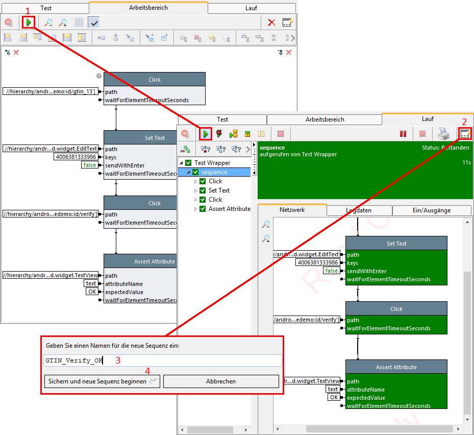 Schließen Sie nun den Recorder. Im Arbeitsbereich des GUI-Browsers sehen Sie, dass für jede der aufgenommenen Aktionen ein Baustein angelegt wurde (Abb. 13). Sie können nun testen, ob sich das Aufgenommene wieder abspielen lässt. Dazu müssen Sie zunächst die App auf Ihrem Gerät in den Anfangszustand zurückbringen, indem Sie auf dem Gerät die Schaltfläche "Home" oben links benutzen. Klicken Sie dann in expecco auf den grünen Play-Knopf (1). Wird alles grün, war die Ausführung erfolgreich. Erstellen Sie nun daraus einen neuen Baustein in der Testsuite, indem Sie auf das Bausteinsymbol (2) in der rechten oberen Ecke klicken. Geben Sie ihm den Namen "GTIN_Verify_OK" (3) und bestätigen Sie (4).