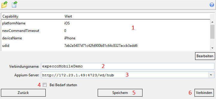 Auf der letzten Seite sehen Sie eine Übersicht aller bisherigen Angaben (1) (Abb. 5). Unterhalb der Capabilityliste können Sie einen Namen für die Verbindung angeben, unter dem sie im GUI-Browser angezeigt wird (2). Außerdem lässt sich eine Verbindung über diesen Namen identifizieren und in Bausteinen verwenden; der Name muss daher eindeutig sein. Falls Sie keinen Namen angeben, wird generisch einer erzeugt. Geben Sie als Namen "expeccoMobileDemo" ein. Im Feld darunter ist die Adresse zum Appium-Server einzutragen (3). Wenn Sie den Appium-Server mit Standardeinstellungen gestartet haben, müssen Sie dazu nur in der Standardadresse (unterster Eintrag der Vorschlagsliste) "localhost" durch die IP-Adresse des Macs ersetzen (im Bild "172.23.1.49"). Um sicher zu gehen, auf welchem Port der Appium-Server lauscht, sehen Sie in dessen Ausgabe. Dort finden am Anfang die Zeile