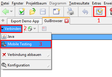 Öffnen Sie nun den GUI-Browser (1) und wählen Sie unter "Verbinden" (2) den Eintrag "Mobile Testing" (3) (Abb. 3), um den Verbindungsdialog zu öffnen.