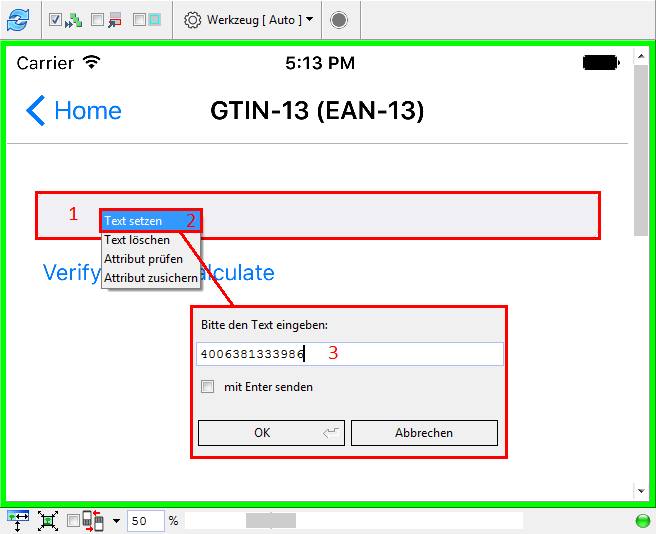Anschließend soll im Eingabefeld der neuen Seite eine korrekte GTIN-13 eingegeben werden. Führen Sie dazu einen Rechtsklick auf dem Eingabefeld (1) aus und wählen Sie im Kontextmenü die Aktion "Text setzen" (2) (Abb. 13). Geben Sie in den sich daraufhin öffnenden Dialog eine beliebige gültige Artikelnummer im GTIN-13-Format ein, bspw. "4006381333986" (3). Dieser Text wird nun in der App gesetzt.