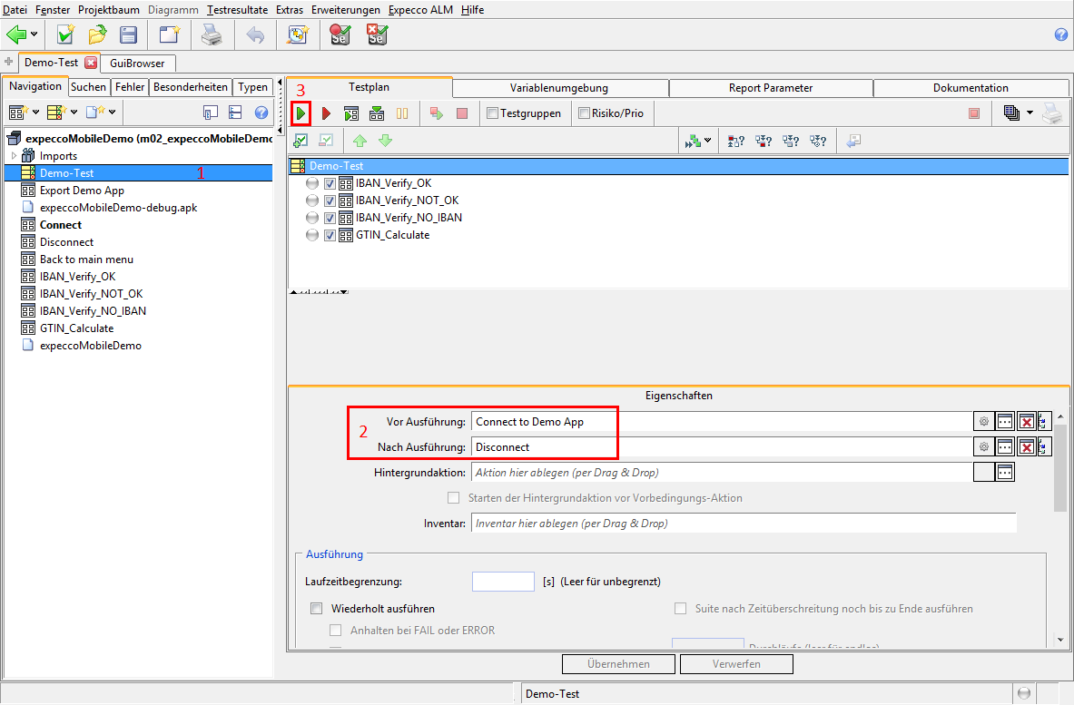Wechseln Sie nun zum Testplan "Demo-Test" (1) (Abb. 10). Dieser Testplan enthält bereits einige fertige Testfälle. Vor und nach der Ausführung (2) ist außerdem jeweils ein Baustein eingetragen: Der eben bearbeitete Baustein "Connect" für den Aufbau und der Baustein "Disconnect" für den Verbindungsabbau. Durch das Eintragen der beiden Bausteine an dieser Stelle geschieht der Verbindungsabbau insbesondere auch dann, wenn der Test vorzeitig abgebrochen wird, z. B. weil einer der Testfälle fehlschlägt.