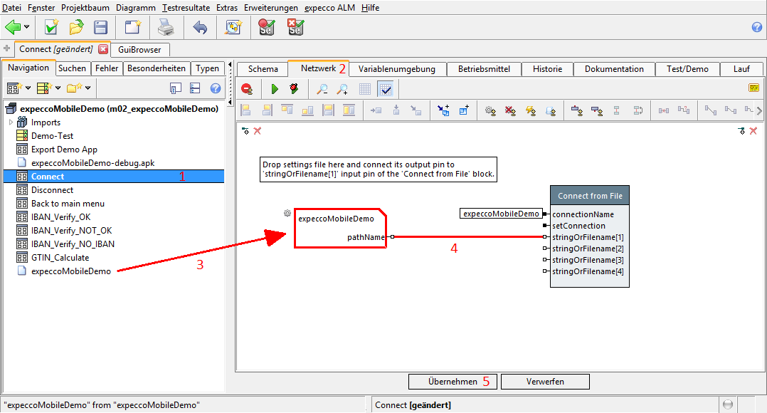 In der Testsuite wurden die Einstellungen als Anhang "expeccoMobileDemo" angelegt (Abb 9). Wählen Sie den Baustein Connect (1) aus und wechseln Sie rechts zur Ansicht "Netzwerk" (2). Ziehen Sie per Drag-and-drop die Einstellungen in das Netzwerk des Bausteins (3). Verbinden Sie den Ausgangspin pathName mit dem Eingangspin stringOrFilename[1] des Bausteins "Connect from File" (4). Mit "Übernehmen" (5) bestätigen Sie die Änderungen. Dieser Baustein wird zu Beginn des Tests die Verbindung zur App herstellen.