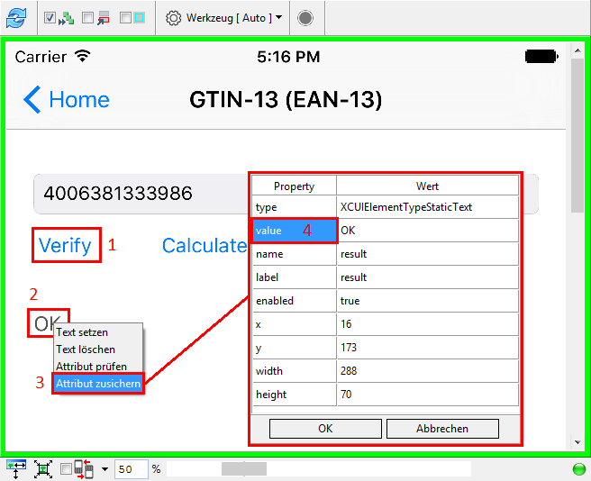 Klicken Sie nun auf "Verify" (1) (Abb. 12). In der App erscheint nun als Ergebnis "OK" (2). Der Test soll feststellen, ob tatsächlich dieses Ergebnis angezeigt wird. Nach einem Rechtsklick darauf können Sie im Kontextmenü die Aktion "Attribut zusichern" (3) auswählen. Wählen Sie im Dialog, der sich daraufhin öffnet, die Eigenschaft value (4) aus und bestätigen Sie mit "OK" (5). Dieses Mal wird keine Aktion auf dem Gerät ausgelöst, sondern nur ein Baustein aufgezeichnet, der fehlschlägt, sollte das Ergebnis vom erwarteten Wert "OK" abweichen.