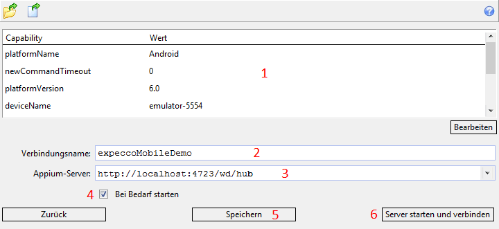 Abb. 5: Verbindungsnamen und Appium-Server konfigurieren