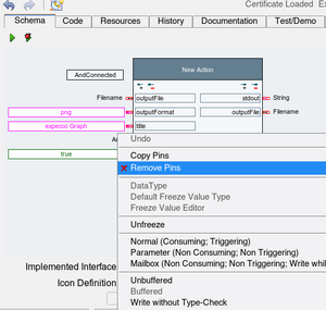 The new created action will have a number of automatically created input and output pins, which we will not need in this example (these pins and their functions will be described later). So those should first be deleted: