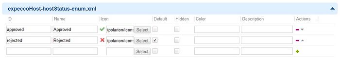 Für das Workitem muss eine Enumeration für den Status angelegt werden (hostStatus). Diese hat die beiden Zustände approved und rejected, wovon der letztere der Default-Zustand ist. Die Enumeration kann durch Hochladen von expeccoHost-hostStatus-enum.xml oder manuell erzeugt werden. Ein expecco-Host kann einen Testlauf nur bearbeiten, wenn er auf approved gesetzt wird. Dadurch muss ein Host nach der Registrierung von expecco aus immer zunächst in Polarion freigegeben werden bevor er ausführen darf.