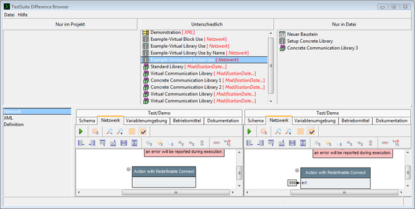 The lower left area presents the individual changes (Name, Interface, Datatype, Network etc.), a diff-presentation of the complete XML representation (for experts and developers) and a definition editor.