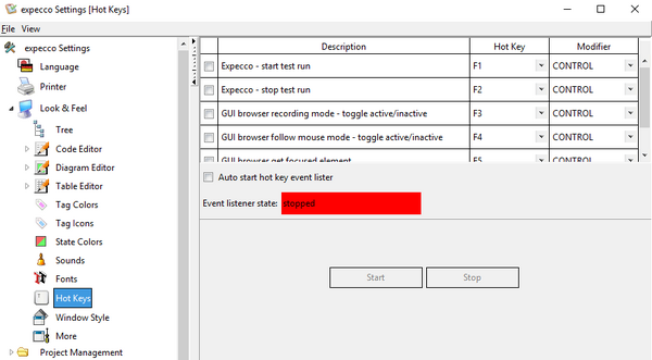To automatically start the hotkey service after expecco's startup, check the "Auto start hot key event listener" toggle. To start the service manually, press the "Start" button. If the "Start" button is disabled, you may have unapplied changes in the settings. Then apply them first.