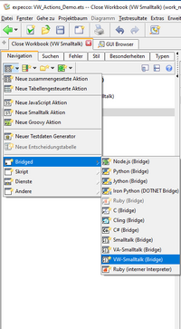 You can create elementary VisualWorks action blocks ("VW actions"), which contain VisualWorks Smalltalk code. These will be executed inside the VisualWorks image. This is similar to remote Smalltalk/X code execution and the API is described in the Bridged Smalltalk Elementary Blocks API Documentation.