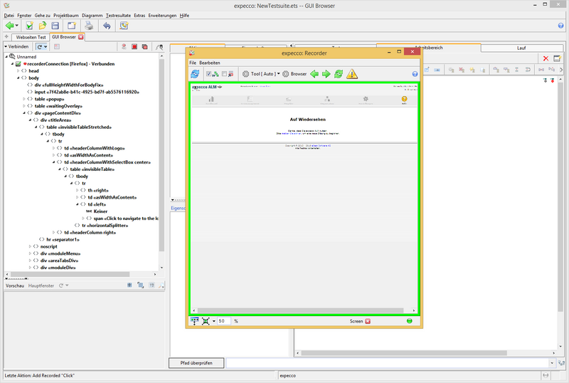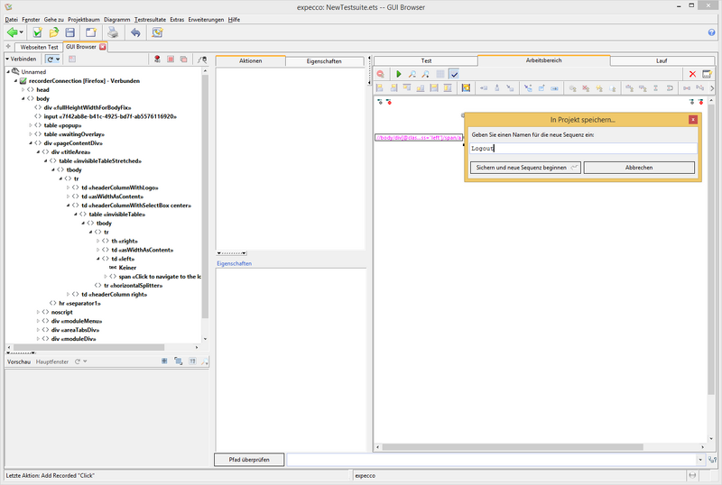 Um mehrere Benutzerdaten zu überprüfen, ist es jetzt notwendig, sich nach der Anmeldung wieder abzumelden. Dafür wird im GUI-Browser eine neue Sequenz mit dem Klick auf den Link "Abmelden" aufgenommen (Verbindung zum Browser wie in Tutorial Webtest 1 aufbauen. Im ferngesteuerten Browser einen funktionierenden Benutzer anmelden (mmustermann / mm)