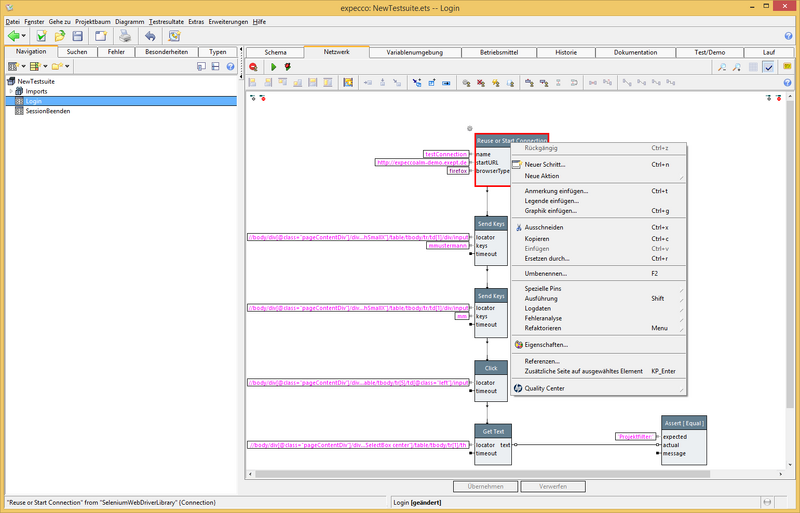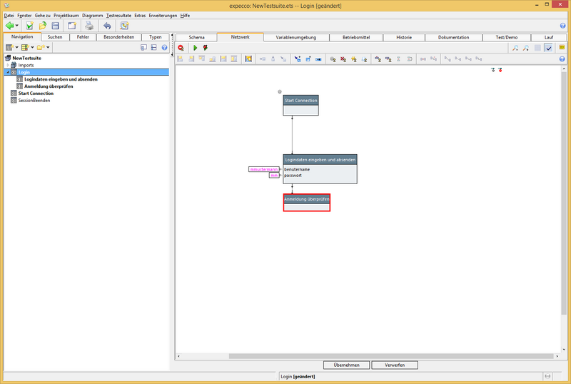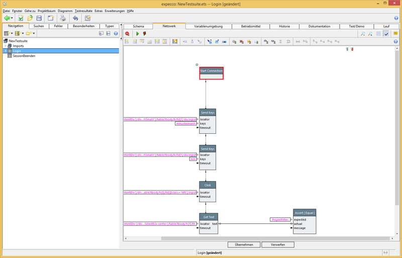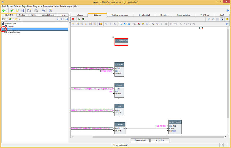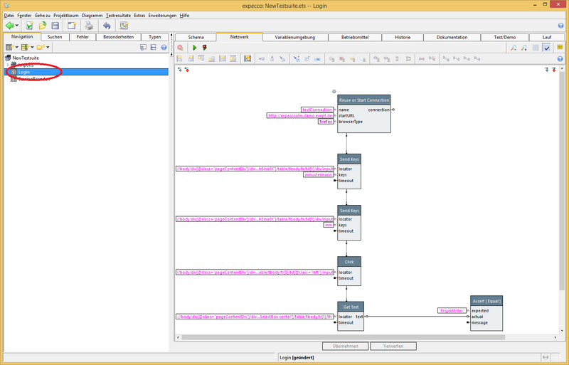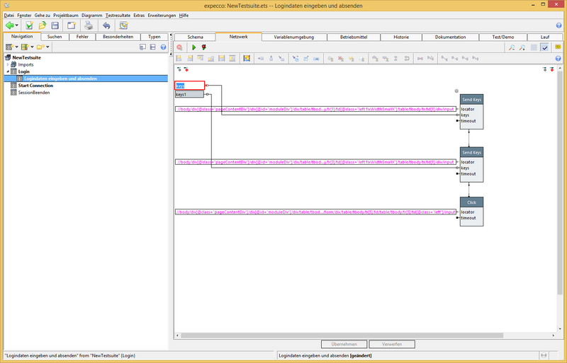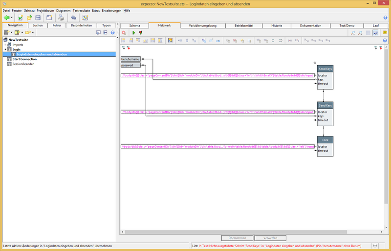 - Nun sind Parameter für den Baustein "logindaten eingeben..." im Baustein "Login" sichbar. Diese mit Werten bestücken.